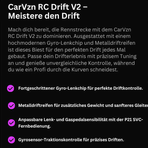 Übernimm die Kontrolle mit dem integrierten fortschrittlichen Gyro-Chip, der präzises Gegenlenken bietet, um ein Schleudern zu verhindern. Stelle ihn nach deinen Wünschen ein – für einfachere oder anspruchsvollere Drifts – und sorge so jedes Mal für sanfte Rutschbewegungen.