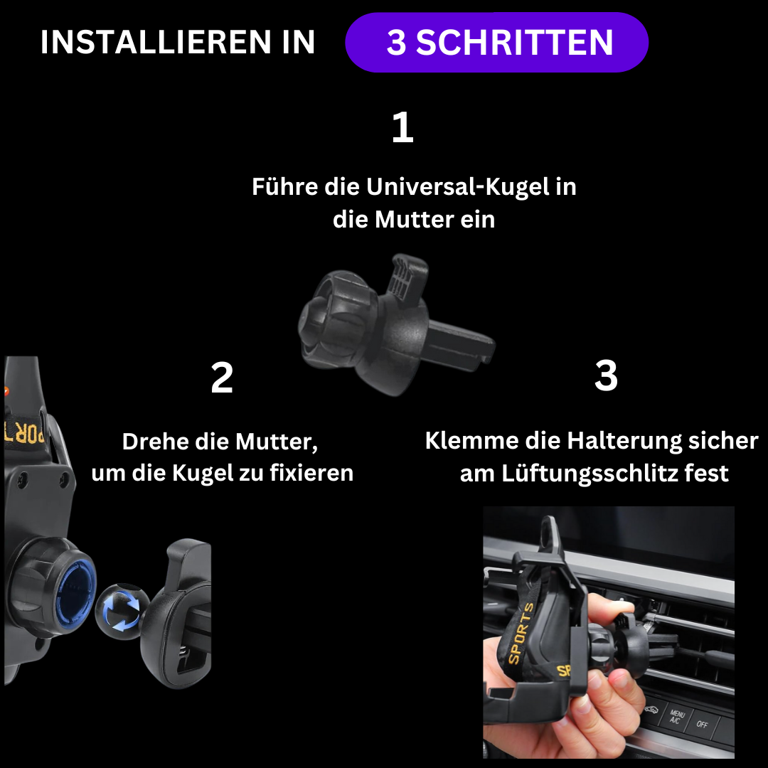 Bring deine Handyhalterung im Handumdrehen an! Einfach das universelle Kugelgelenk einstecken, festziehen, und an der Lüftung befestigen. Schnell, simpel und sofort bereit für jede Fahrt.